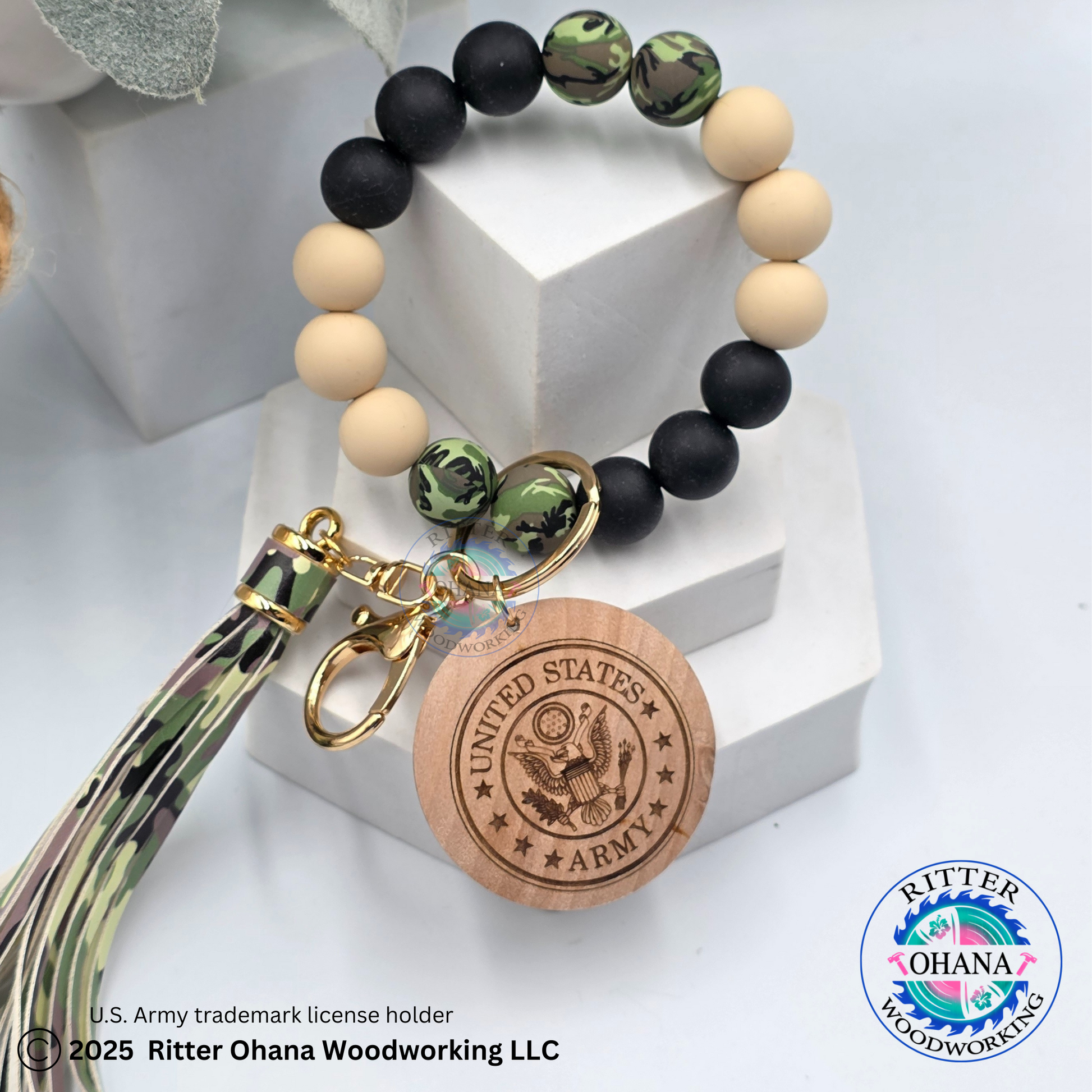 Carry your keys with pride and style! This U.S. Army beaded bracelet keychain is both practical and meaningful, designed for anyone who wants to show off their Army pride every day. Features red, white, and blue silicone beads, a star-pattern tassel, and laser engraved wooden Army disk, that can be personalized for that special touch.